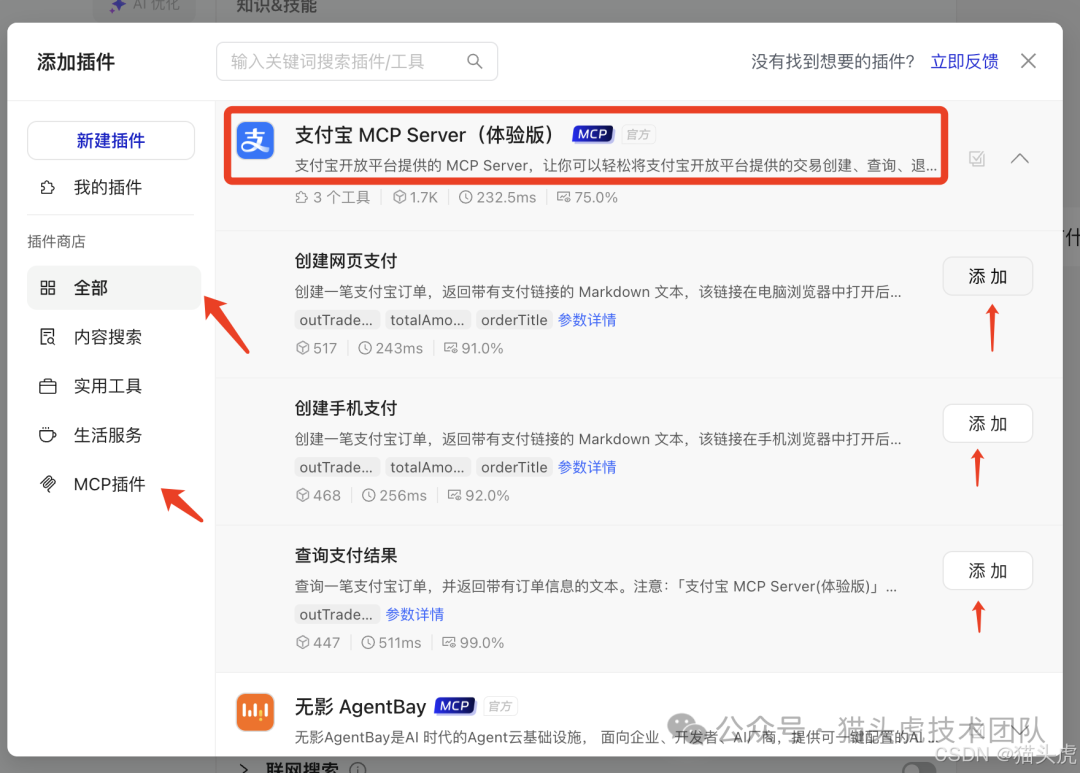 在弹出的插件商店界面中,切换到「MCP插件」专区,找到【支付宝 MCP Server(体验版)】插件。