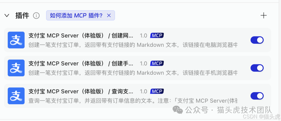 至此,支付宝MCP插件已经成功添加,下一步,我们将配置角色与指令,让智能体真正能够调用MCP服务执行任务!