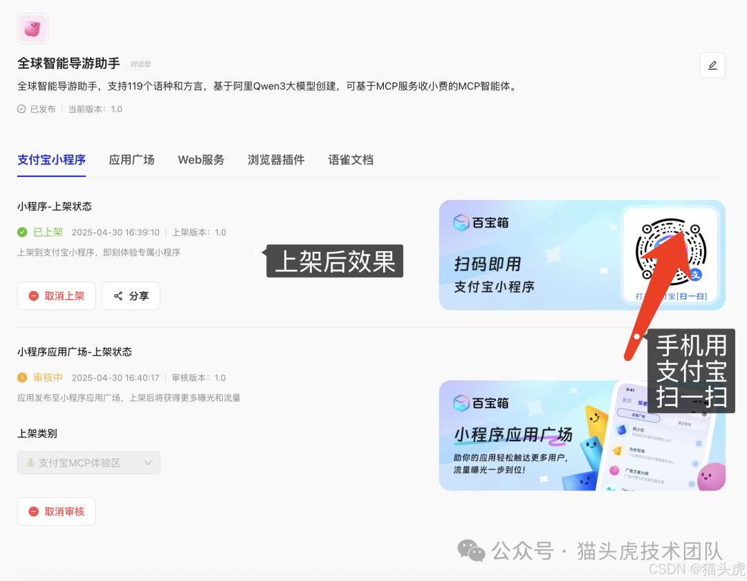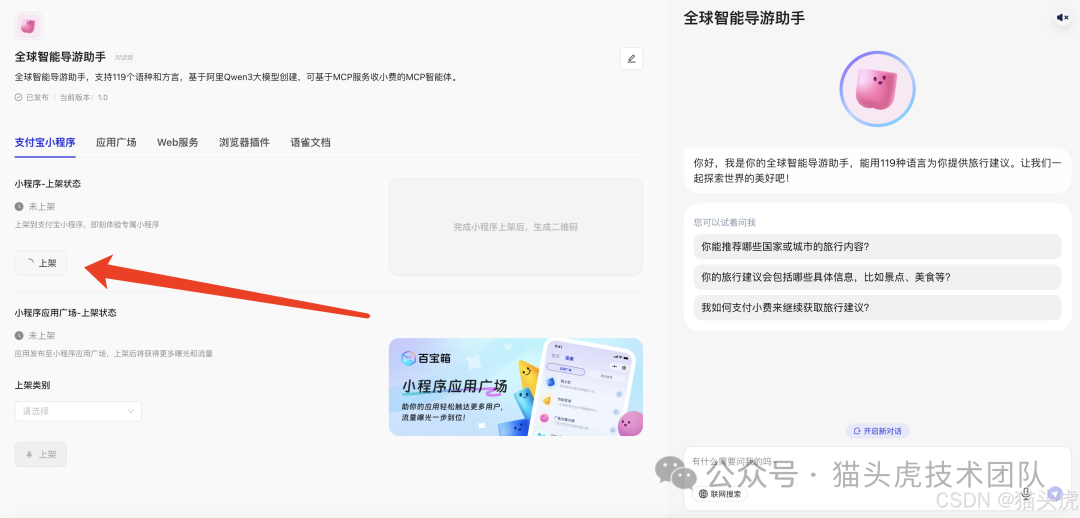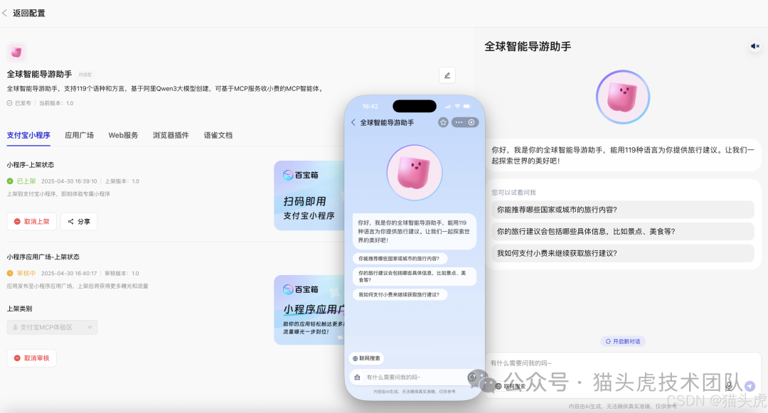 通过以上 6 步,我们已经成功在蚂蚁百宝箱中构建并发布了一个基于 Qwen3 + 支付宝 MCP 的智能体应用。从智能体创建到插件配置、再到小程序上线,整个过程高效流畅,大幅降低了 AI 应用开发和变现的门槛。