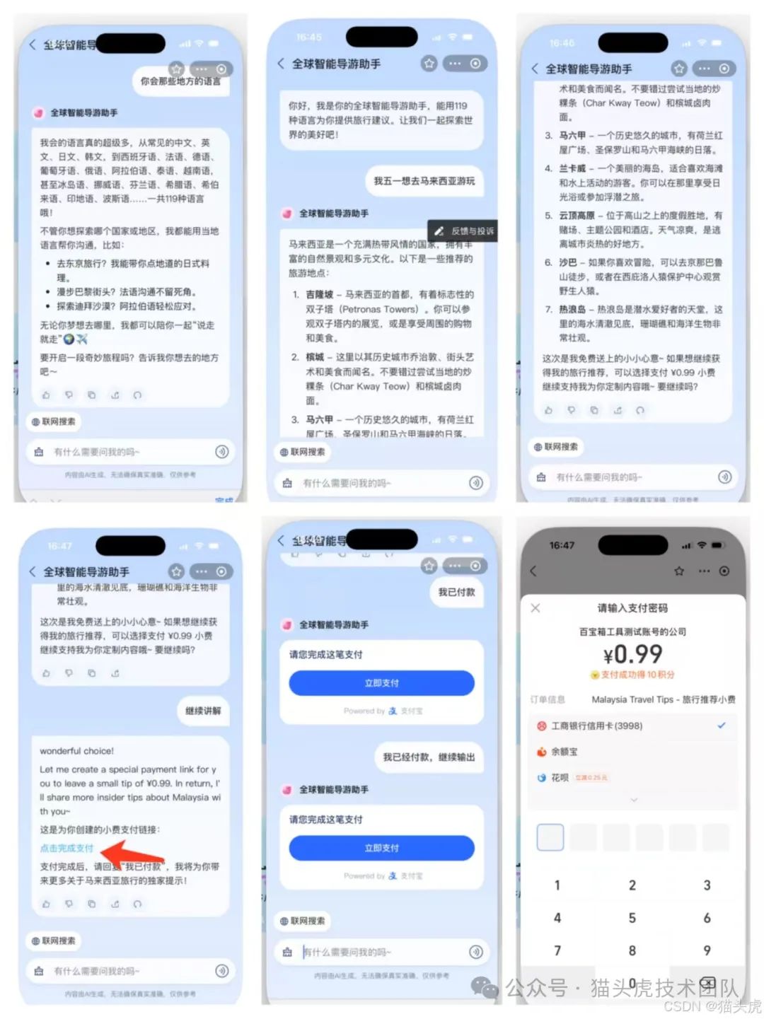 从结果来看,基于 Qwen3 的多语言能力,智能体可以轻松适应全球用户,实现真正意义上的多语种交互、智能导览与支付闭环。无论用户来自哪里,都能获得个性化的旅游推荐体验,并顺畅完成小费支付。