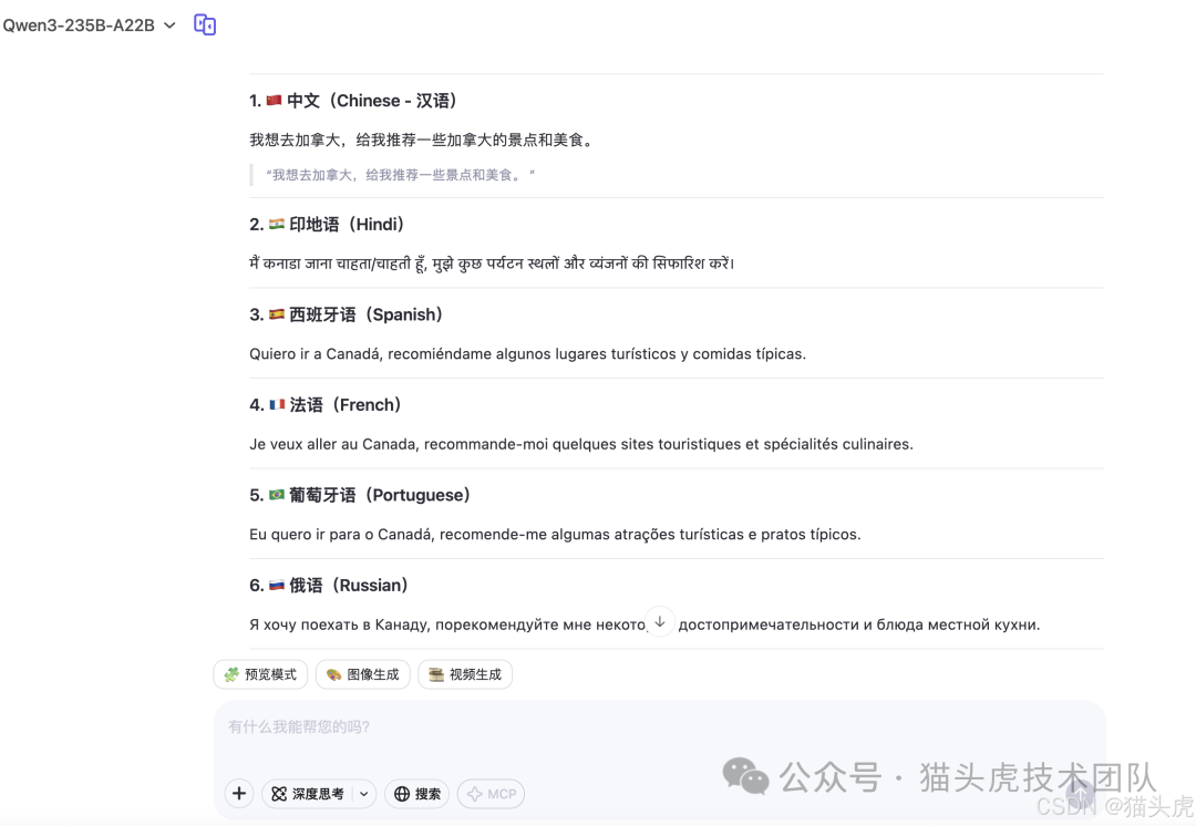 为了验证多语言能力,这里准备了 6 种不同语言的提示词进行测试: