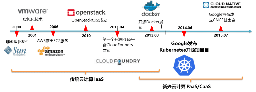 早在 06 年的时候 Amazon 基于容器技术构建的 IaaS 平台 AWS,成为所有云计算厂商的鼻祖,由于技术领先的优势 AWS 现在依然也是云计算行业老大 13 年 Docker 的诞生进一步简化容器技术的使用门槛,Docker 公司自以为掌握云时代的核心技术,开始野心勃勃的有意挑战传统的云计算大厂例如 RedHat,Google 的江湖地位,公司股价也是一骑绝尘,却不料被 RedHat 联合 Google 发布的 Kubernetes 击溃,Kubernetes 的成功让大家以为容器技术并非云时代的核心技术,容器编排 才是核心技术。(备注:2020 年 K8S 官方宣布只要满足 K8S CRI 接口的容器均可以被 K8S 进行编排,Docker 被时代抛弃) 2015 年借助 Kubernetes 的成功,Google 宣布成立 CNCF 基金会,这是云原生时代的代表性的组织。致力于完善云时代的基础设施,帮助开发者构建更出色的产品
