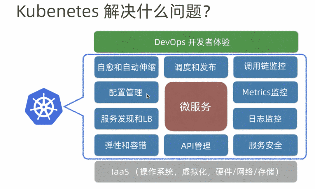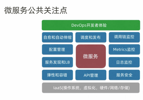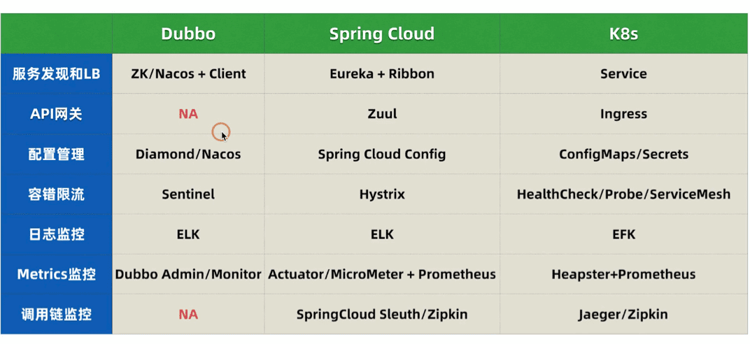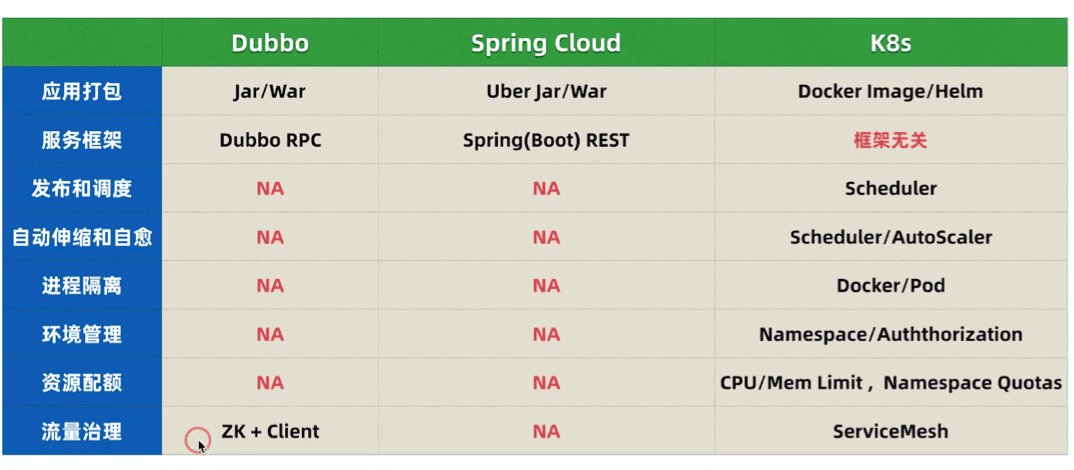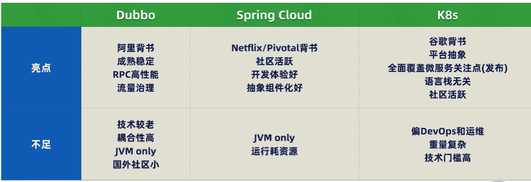 通过横向对比,我们可以看到不论是 Dubbo 还是 Spring Cloud 对比 Kubernetes 都有诸多缺点。相比阿里巴巴的 Dubbo、Netflix 的 Spring Cloud, Google 提供的 Kubernetes 才是具备完整的一站式的微服务解决方案的技术方案。如图: