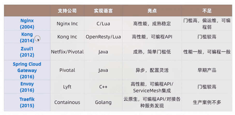网关是微服务的大门,因为网关对于对微服务来说至关重要,是微服务弹性伸缩的能力来源。并且网关的开发成本其实并不高,所以市场面有很多单独的网关产品,我们可以简单看看,如图: