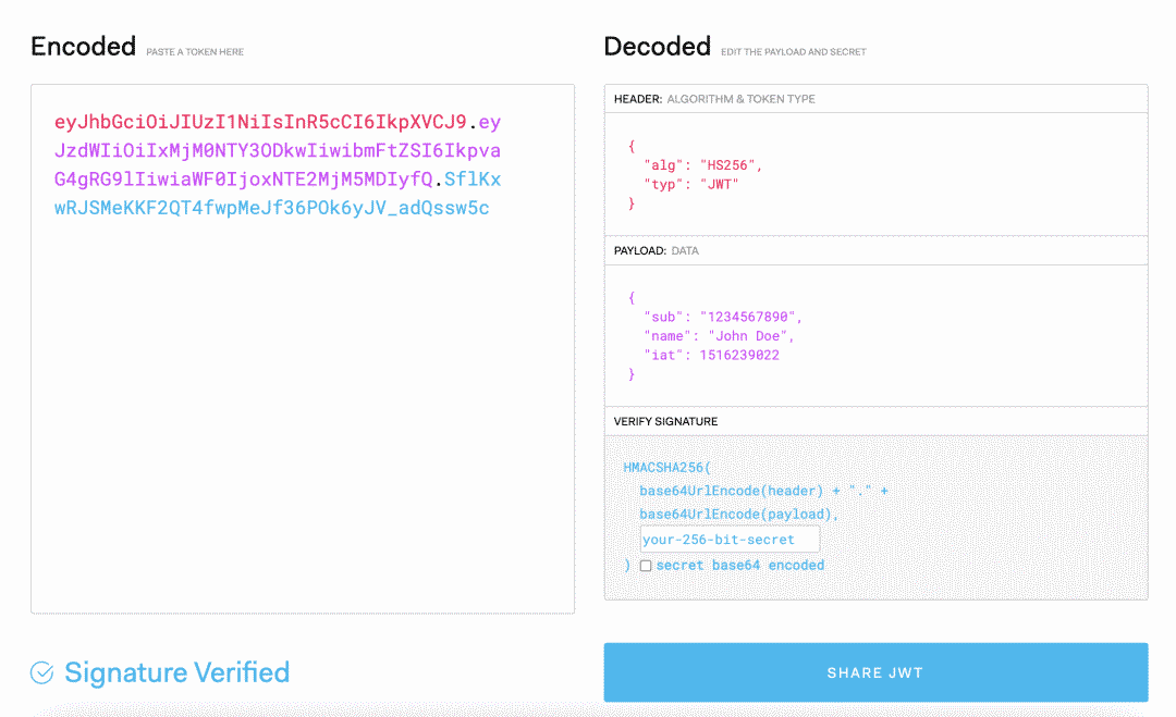 JWT 备受推崇,广泛使用的原因,是因为它在由 Auth 服务颁发令牌后,在网关即可验证令牌合法性,无需再请求认证服务,请求少,性能好。令牌本身还可以自包含少量的用户信息,JWT 大概是一串这样的编码,它由三个部分组成,你可以通过 JWT IO 这个网站对 JWT 进行解码,从而获取 JWT 中的信息:
