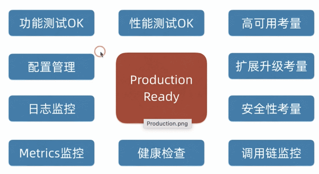 说完了开发环节,最后来说说微服务是怎么运维的。我们知道仅仅只是 完成功能(Feature-Complete) 只是软件开发流程中很少的一部分,那么从完成编码到 生产就绪(Production Ready),还需要经历哪些环节 ?我们可以参考下图: