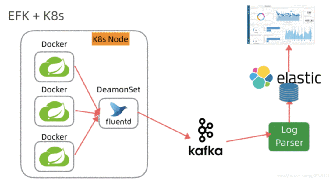 Fluentd 会将采集的日志直接发到 ElasticSearch,中间也可以增加 kafka 作为缓存层 ElasticSearch 通过 Log Parser 初步解析日志,可以过滤垃圾日志 通过 Kibana Dashboard 查询 ElasticSearch 显示日志