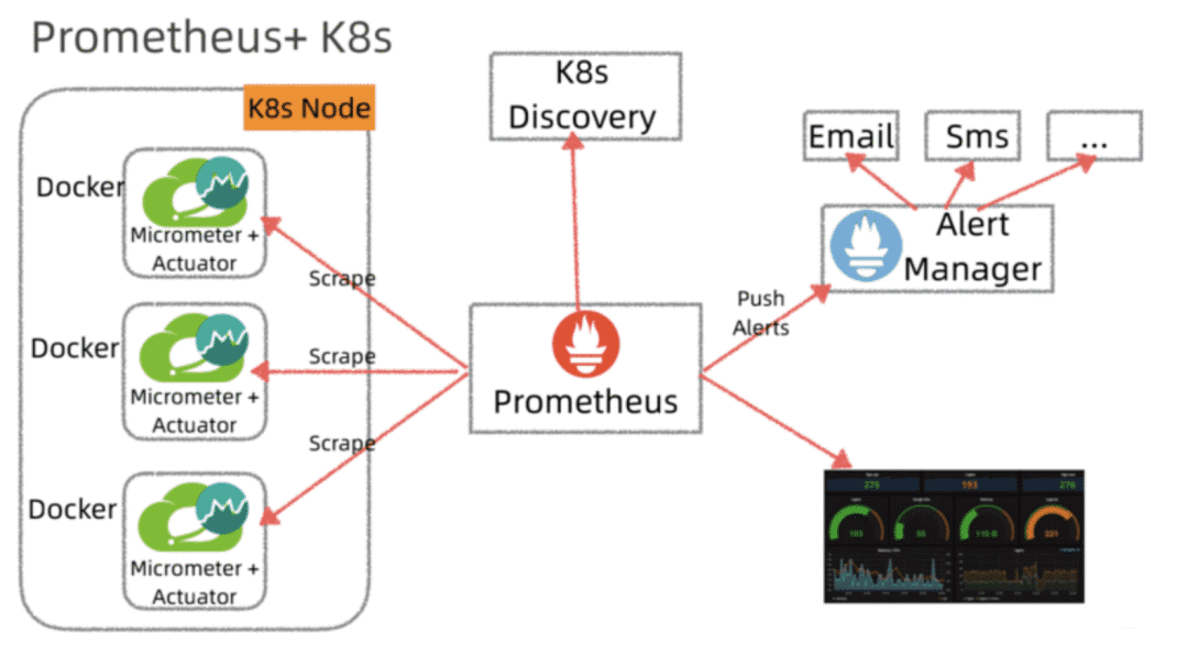 通过 Prometheus 发现 Kubernetes 服务 通过 Alert Manager 监控和报警 Email,SMS 通过 Grafana 展现和监控服务的运行各项指标