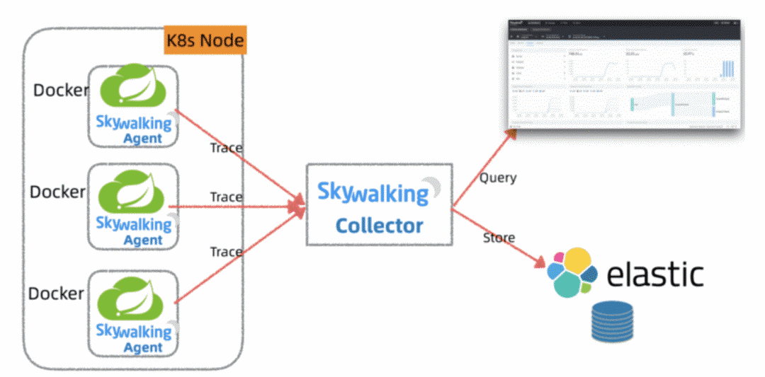 Skywalking 是无侵入分布式链路跟踪框架,可以在不添加一行代码的前提下完成对微服务分布式系统的链路跟踪,是目前主流的分布式链路跟踪的解决方案,2019 年 SkyWalking 成为 Apache 顶级项目,SkyWalking 的作者吴晟也因此当选为 Apache 软件基金会首位华人董事,这里就不展开讲了,SkyWalking 工作大致工作原理如下: