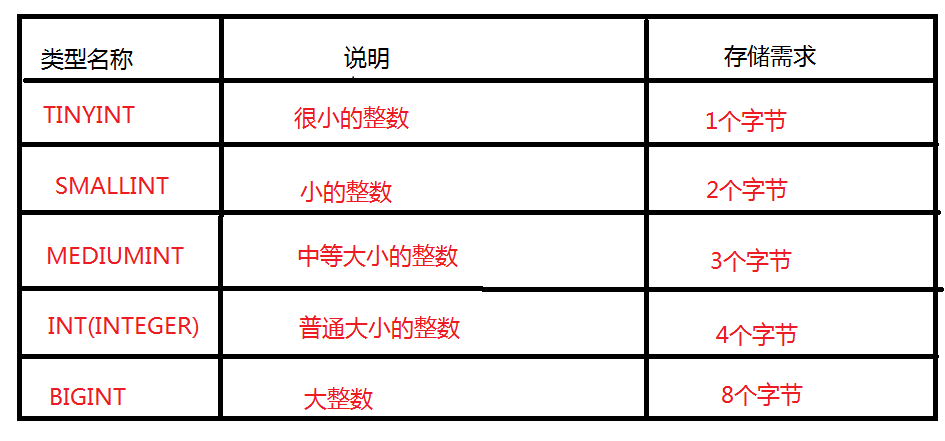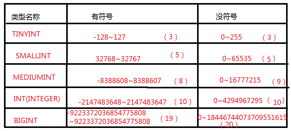 整数类型:TINYINT、SMALLINT、MEDIUMINT、INT、BIGINT