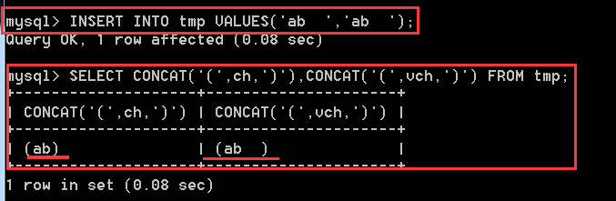 SELECT concat( '(', ch ,')' ),concat( '(',vch,')' ) FROM tmp;//这句话的意思就用(将结果包起来,用来观察输出的字符长度)