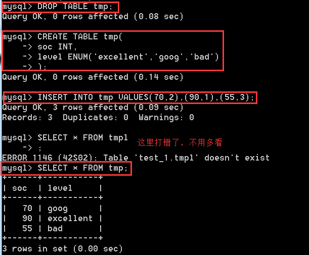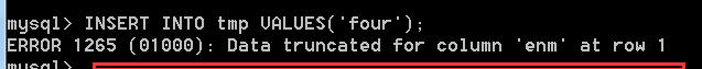 解释:enm字段的数据类型为ENUM,枚举类型,那么在插入该字段中的值只能为枚举中的这几个值,不能插入别得值,否则报错