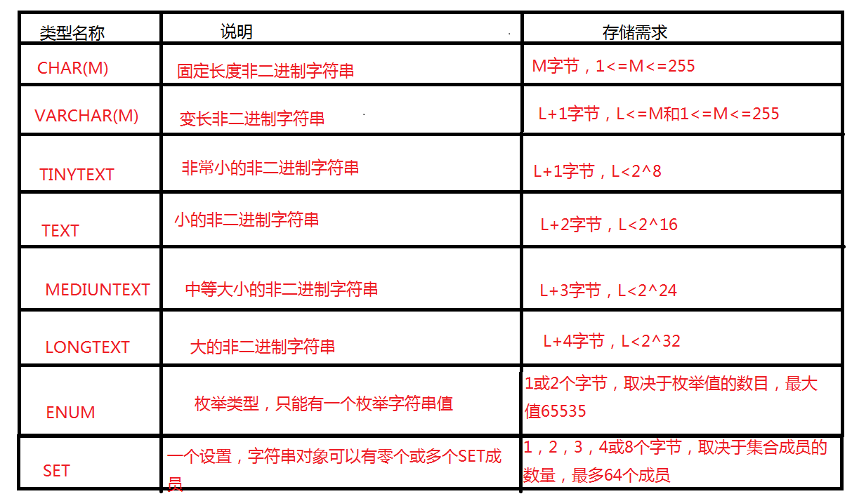 有CHAR、CARCHAR、TINYTEXT、TEXT、MEDIUMTEXT、LONGTEXT、ENUM、SET