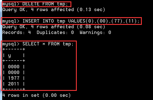 向表中插入数据:INSERT INTO tmp VALUES(0),(00),(77),(11);