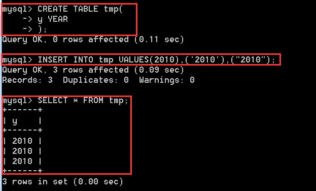 向表中插入数据:INSERT INTO tmp VALUES(2010),('2010'),("2010");