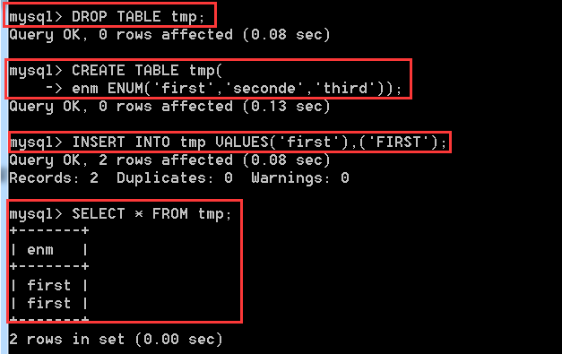 INSERT INTO tmp VALUES('first'),('FIRST');