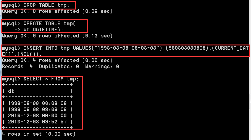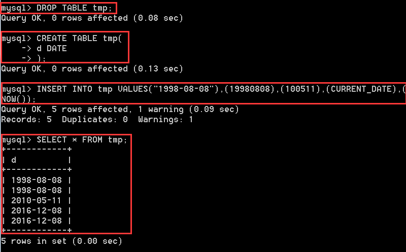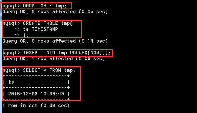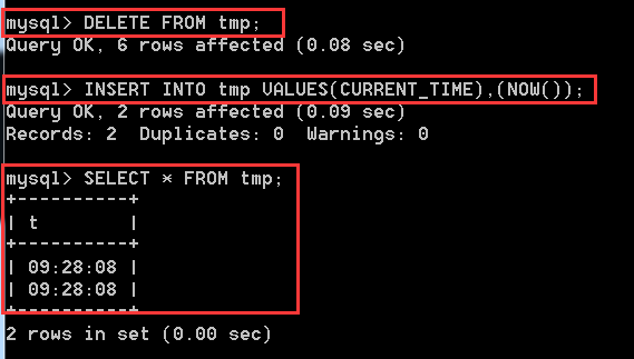 INSERT INTO tmp VALUES(CURRENT_TIME),(NOW());