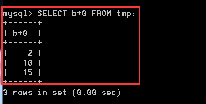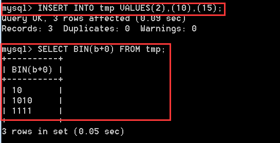 解释:我们将2,10,15这三个10进制存入数据表中,其字段为BIT类型,所以在表中存放的是二进制数,但是将其显示出来,要先将二进制数转换为对应的数字的值,也就是通过b+0, 然后在通过BIN()函数将数字转换为二进制。我们可以尝试不用BIN()函数,只用b+0,看输出什么