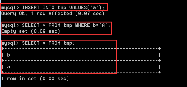 解释:在tmp表中存放了一个小写a,然后通过大写A查找表中,看是否能找到a,结果找不到,就验证了我们上面的说法,具有区分大小写的功能。