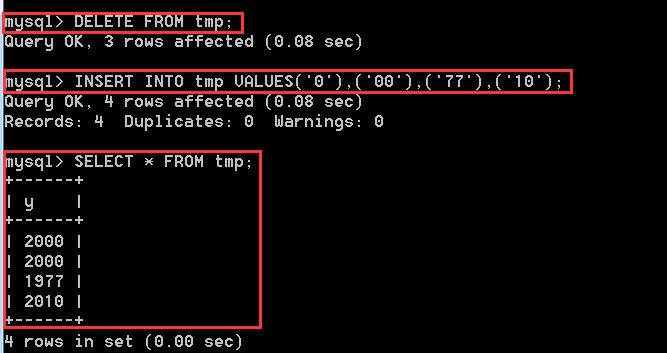 例子一:就拿上面那张tmp表来说。向表中插入用字符串代表的YEAR值,'’0' 、'00'、 '77'、 '10'