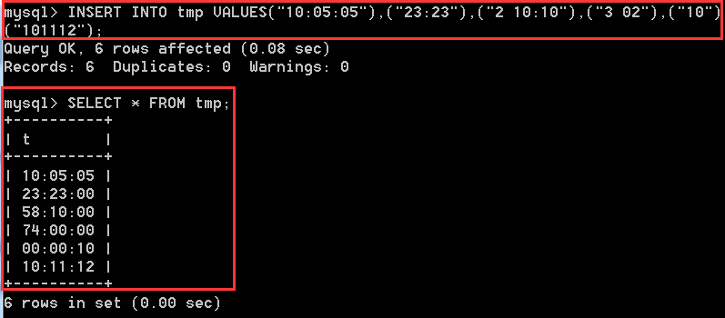 INSERT INTO tmp VALUES("10:05:05"),("23:23"),("2 10:10"),("3 02"),("10"),("101112");