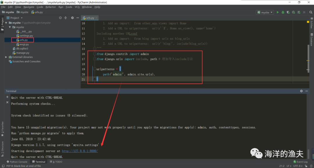 :Django 项目的配置文件。如果你想知道这个文件是如何工作的,请查看 Django settings 了解细节。mysite/urls.py