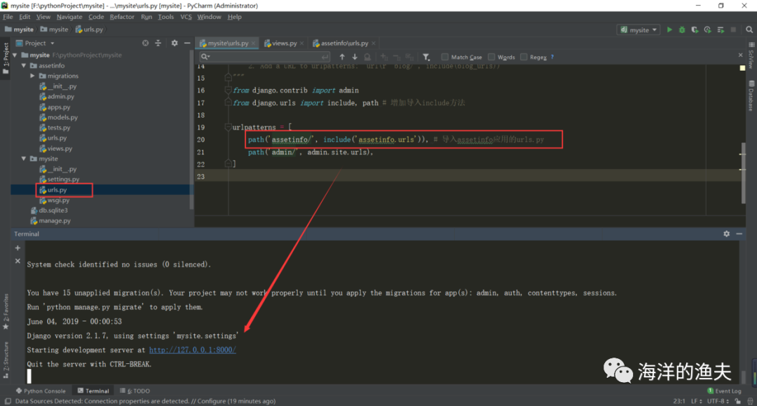 设计 `include()`[4] 的理念是使其可以即插即用。因为应用有它自己的 URLconf( assetinfo/urls.py