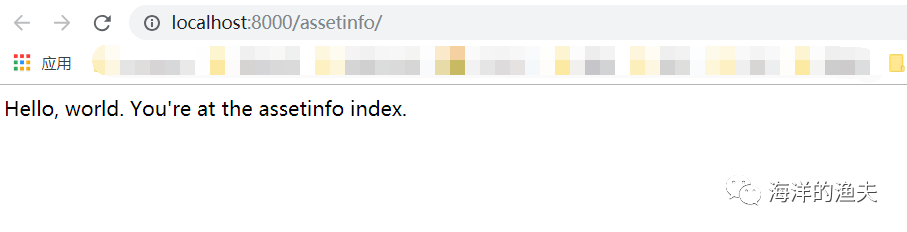 用你的浏览器访问 http://localhost:8000/assetinfo/,你应该能够看见 "Hello, world. You're at the polls index." ,这是你在 index