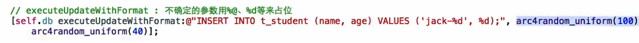 60 // [self.db executeUpdateWithFormat:@"INSERT INTO t_student (name, age) VALUES (%@, %d);", name, arc4random_uniform(40)];