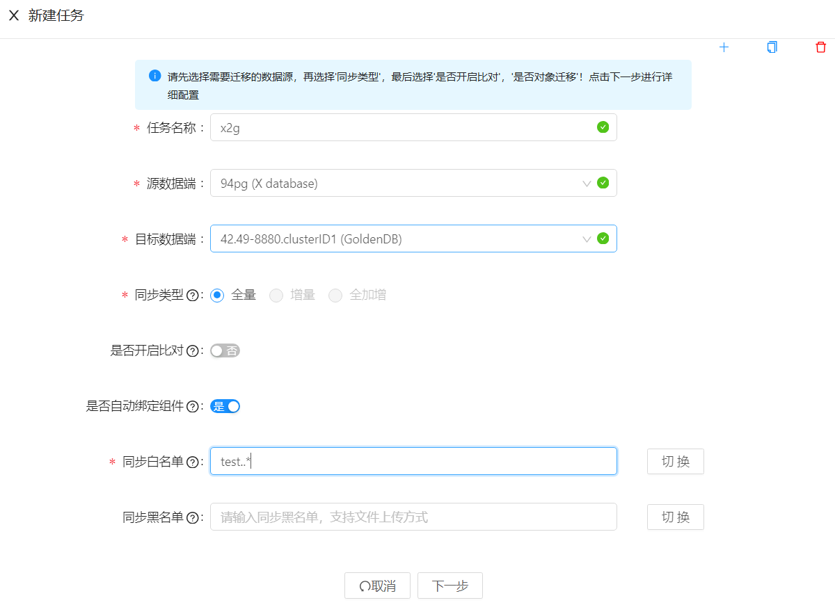 选择是时,在全量迁移过程中进行数据比对,选择否时,在全量迁移过程中不进行数据比对。