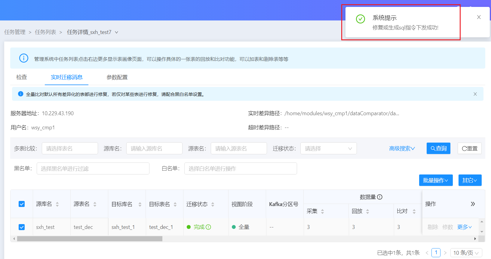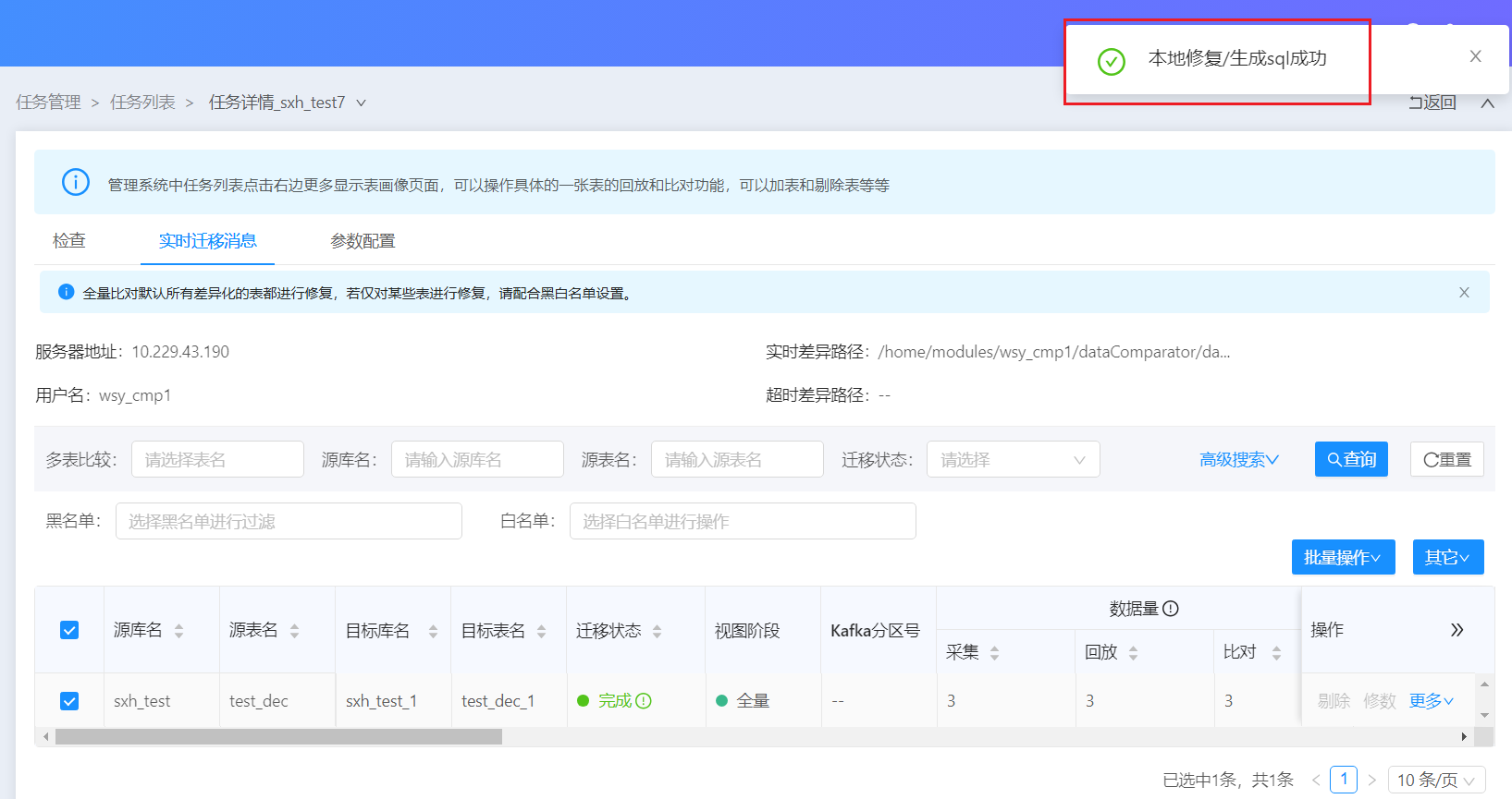 在全量表视图中,可以通过配置修复黑白名单来对产生差异化的表进行批量修复。