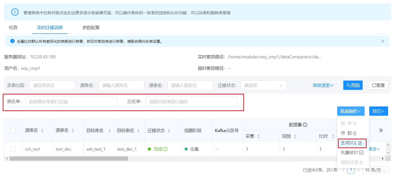 - 全量比对的差异化数据可以通过指定白名单或黑名单来控制表级生成 SQL 或修复。白名单和黑名单互斥,选择一个后另一个自动不可用。若不输入任何内容,则默认所有有差异的表都将参与修复或生成 SQL。