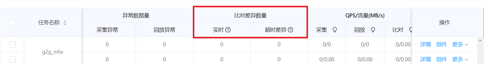 在任务列表中,差异比对分为 实时差异 和 超时差异 。实时差异数量和超时差异数量显示在比对差异数量下方。如果增量比对阶段的实时差异在360分钟内未被消除,则会被标记为超时差异。