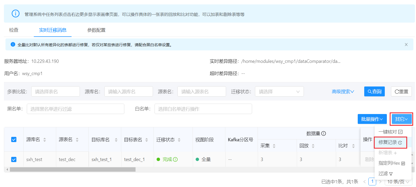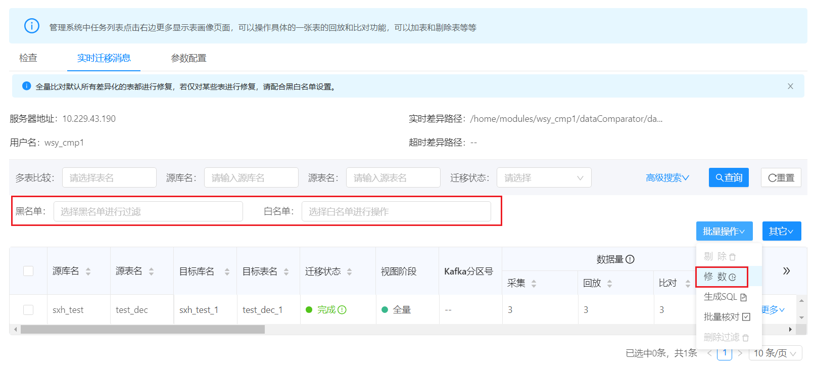 在下拉框中选择 黑名单 或 白名单 以指定要修复的表(修复黑名单和白名单不能同时选择),点击 批量操作->修数 ,即可对目标端差异化表进行修复。