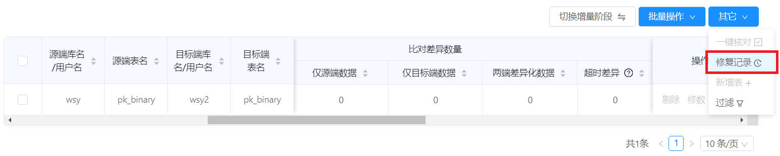 ./dataComparator/data/diffSql目录中查看,实时差异路径可以在表视图页面查看。点击 其它->修复记录 ,可以查看最多最近十次的历史修复记录。
