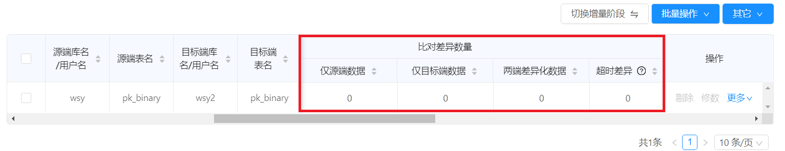 在表视图中,可以查看每张表的具体差异详情,包括仅源端数据、仅目标端数据、两端差异化数据以及超时差异。