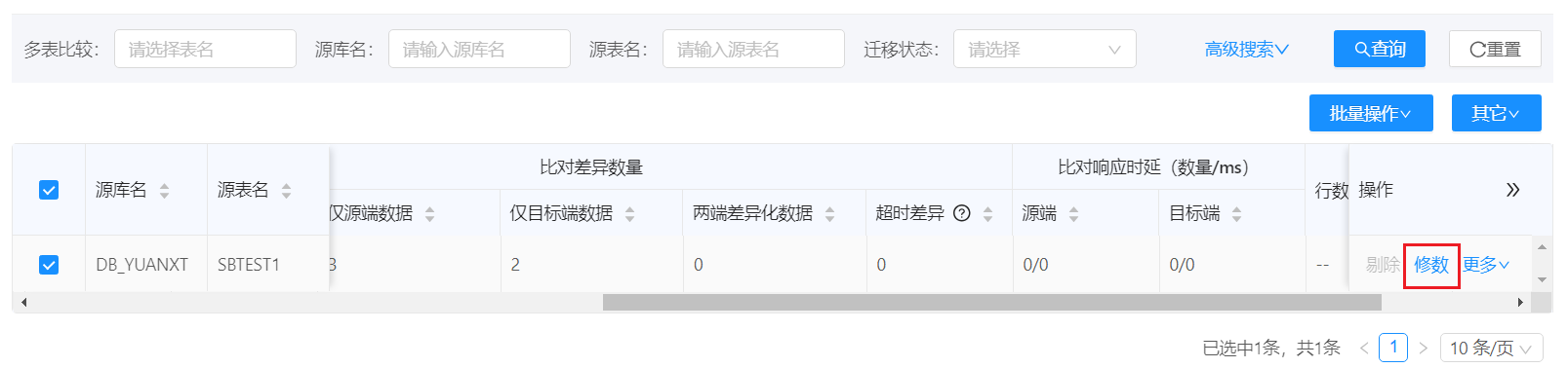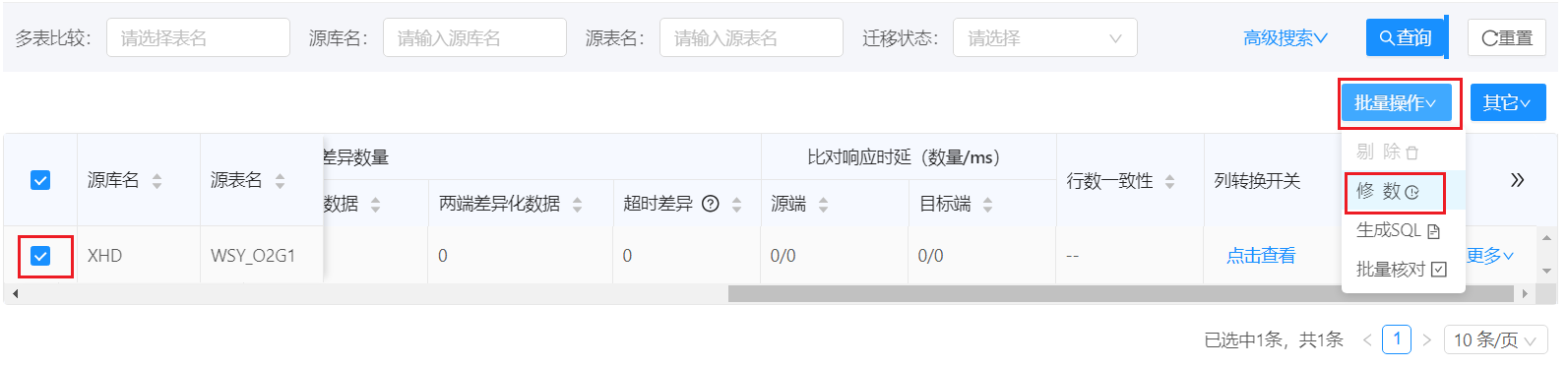 多表修复 :在表视图页面,勾选待修复的差异化表前的多选框,点击 批量操作->修数 ,可以批量对有差异化的表进行修复操作。