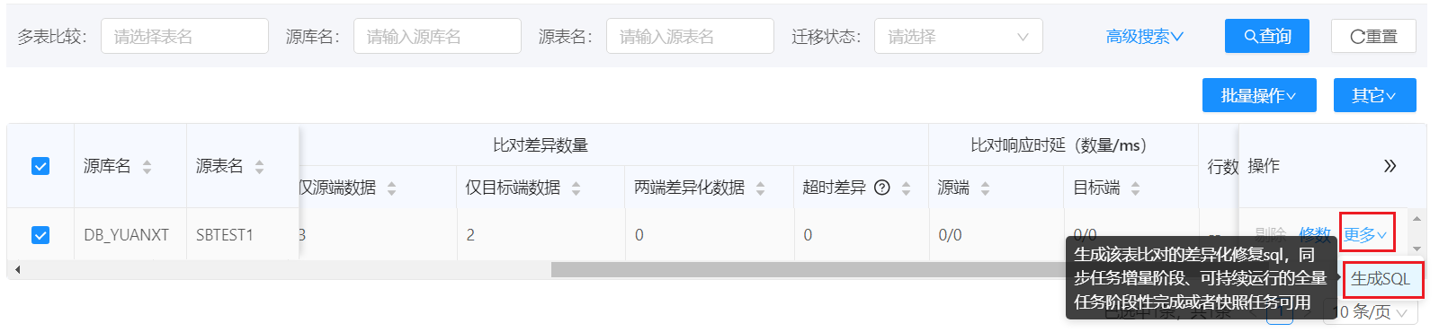单表生成 SQL :在待修复的表操作栏下,点击 更多->生成 SQL ,可以为单个目标端差异化表生成修复 SQL 语句。