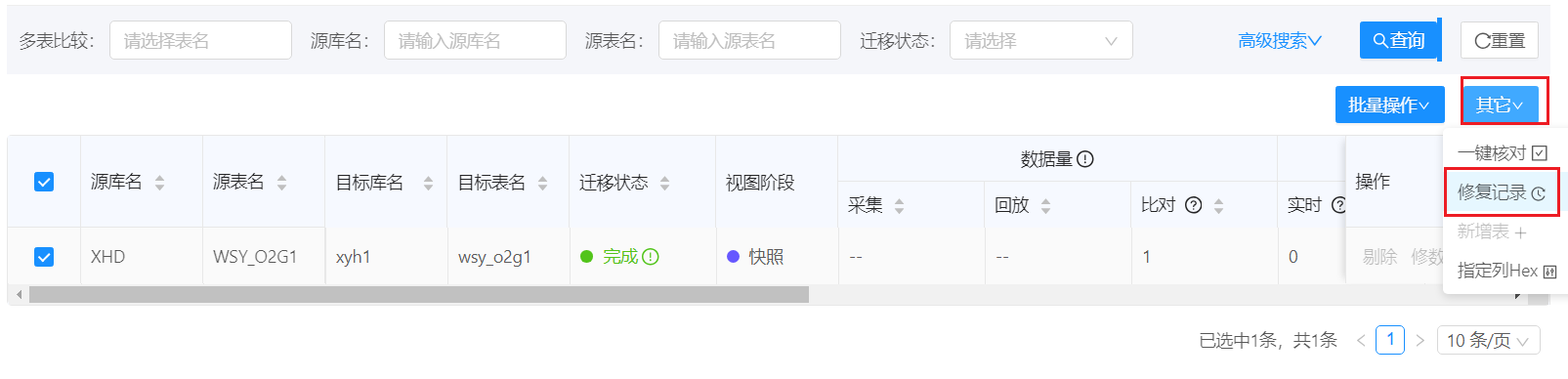 在增量表视图中,可以对产生差异化的单表进行修复,也可以通过多选框对多表进行批量修复。