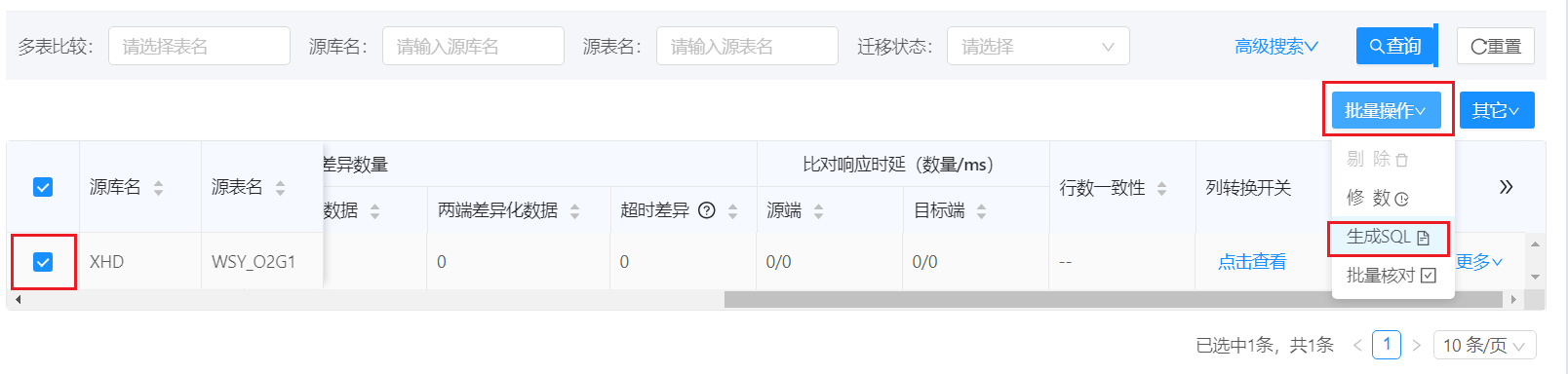 多表生成 SQL :在表视图页面,勾选待修复的差异化表前的多选框,点击 批量操作->生成 SQL ,可以批量生成多张目标端差异化表的修复 SQL 语句。