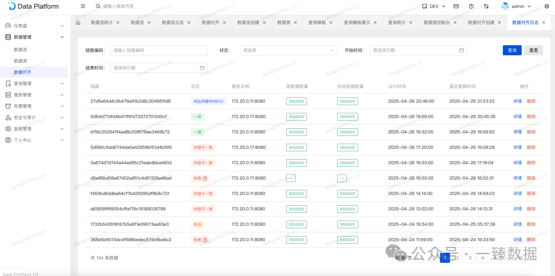当出现数据不一致时,会进行告警,并提供运行日志以及差异数据展示。