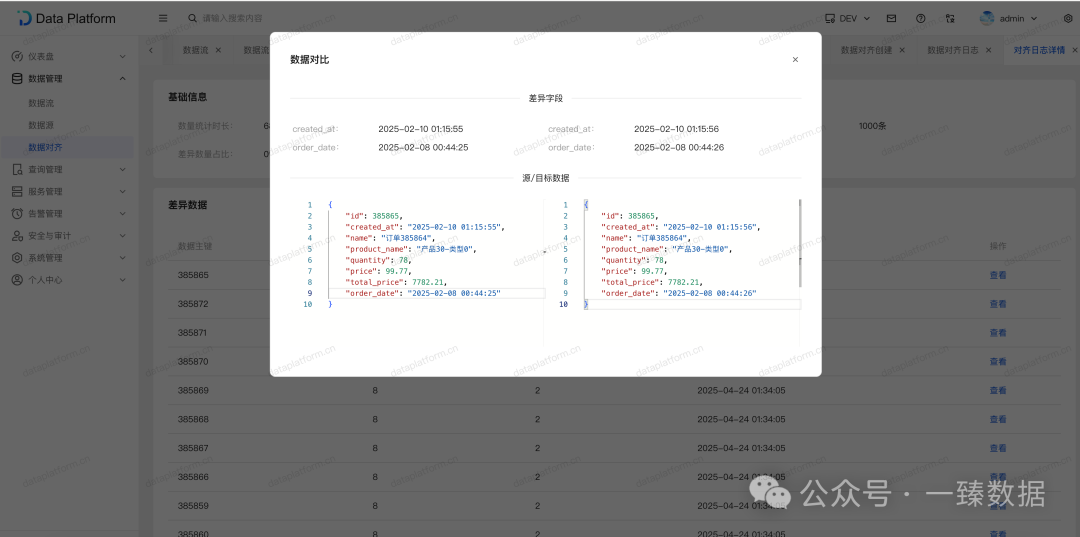 如果出现差异时,则可以查询差异数据,以及差异的具体字段明细。