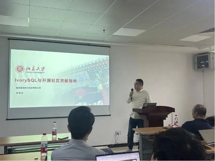 瀚高研发工程师矫顺田在通识课上带来了《IvorySQL 与开源社区贡献指南》的主题分享。讲师矫顺田在北大课程中介绍,IvorySQL 基于 PostgreSQL 打造,通过双解析器引擎(Oracle/PostgreSQL 语法兼容)和双端口设计(5432/1521)实现与 Oracle 高度兼容,内核动态钩子与插件ivorysql_ora
