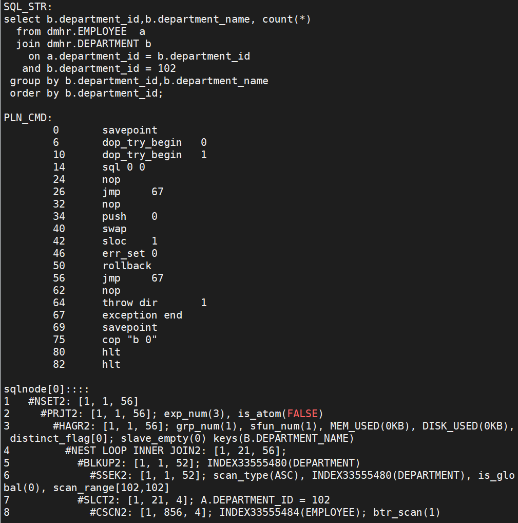 SQL> set long 10000SQL> select SF_TRACE_DUMP_PLN(139738210157456);行号SF_TRACE_DUMP_PLN(139738210157456)---------- --------------------------------------------------------------------1*** 2025-04-25 14:03:52.677000000*** start dump the infos of pln[139738210157456].npln cache infos:scp cachetype: 0over flow: 0disable: 0fixed number: 2ts value: 10868type: 0hash val: 1786077120schid: 150994945user id: 50331649obj id: 0--rs cachers can cache: 0rs cache size: 0talbes' size: 2PLN_CREATE_TIME: 2025-04-25 14:01:53.000SQL_STR:select b.department_id,b.department_name, count(*)from dmhr.EMPLOYEE ajoin dmhr.DEPARTMENT bon a.department_id = b.department_idand b.department_id = 102group by b.department_id,b.department_nameorder by b.department_id;PLN_CMD:0 savepoint6 dop_try_begin 010 dop_try_begin 114 sql 0 024 nop26 jmp 6732 nop34 push 040 swap42 sloc 146 err_set 050 rollback56 jmp 6762 nop64 throw dir 167 exception end69 savepoint75 cop "b 0"80 hlt82 hltsqlnode[0]::::1 #NSET2: [1, 1, 56]2 #PRJT2: [1, 1, 56]; exp_num(3), is_atom(FALSE)3 #HAGR2: [1, 1, 56]; grp_num(1), sfun_num(1), MEM_USED(0KB), DISK_USED(0KB), distinct_flag[0]; slave_empty(0) keys(B.DEPARTMENT_NAME)4 #NEST LOOP INNER JOIN2: [1, 21, 56];5 #BLKUP2: [1, 1, 52]; INDEX33555480(DEPARTMENT)6 #SSEK2: [1, 1, 52]; scan_type(ASC), INDEX33555480(DEPARTMENT), is_global(0), scan_range[102,102]7 #SLCT2: [1, 21, 4]; A.DEPARTMENT_ID = 1028 #CSCN2: [1, 856, 4]; INDEX33555484(EMPLOYEE); btr_scan(1)end dump the infos of pln[139738210157456].