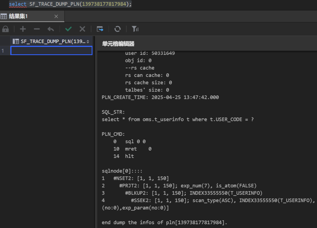 SF_TRACE_DUMP_PLN函数是DM新版本才支持的功能,可以直接将对应CACHE_ITEM的执行计划内容返回到客户端。