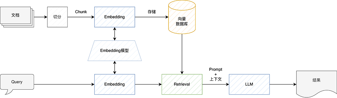 索引:利用 Embedding 模型将文档分块转化为向量,并存储在向量数据库中。 检索:将查询转化为向量,通过相似性算法在向量数据库中查找相关上下文文档。 生成:将查询和检索到的上下文文档输入到大型模型中,以生成高质量的结果。