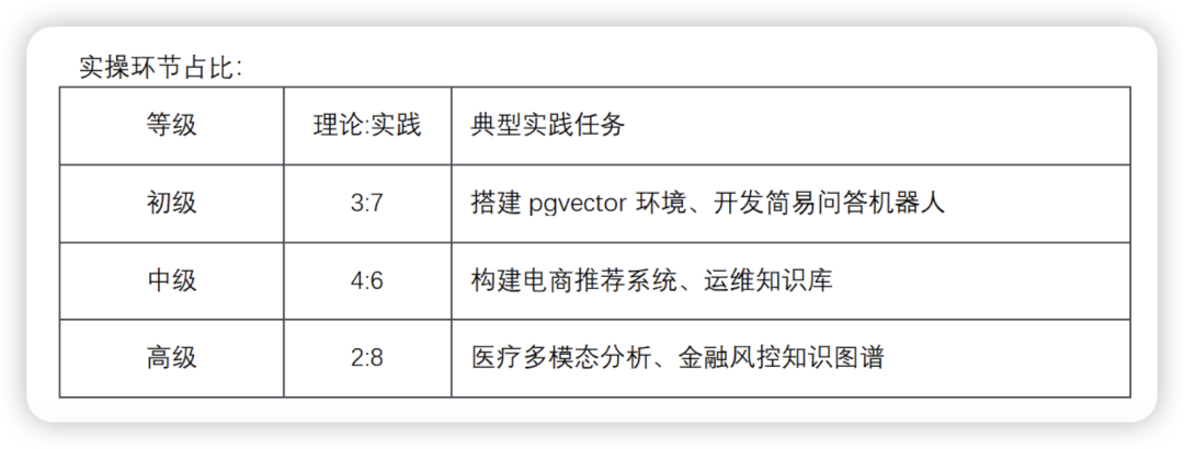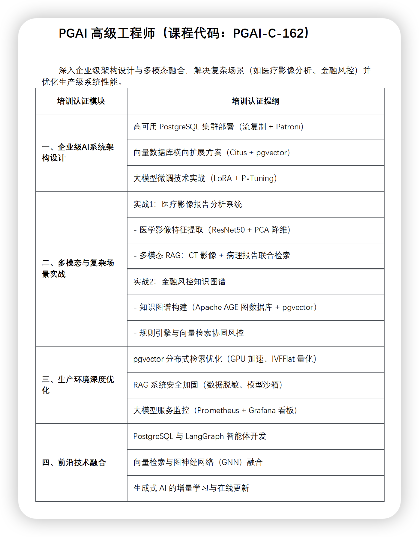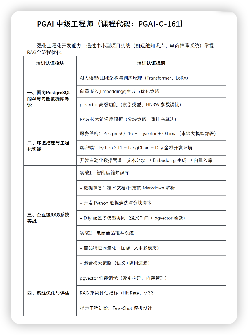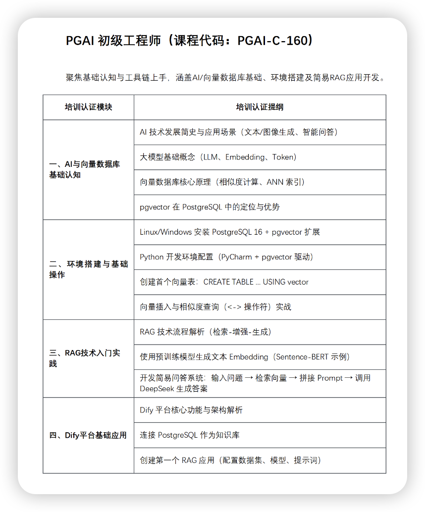 为了面向企业数据AI融合应用场景提供专业人才保障,现推出面向PostgreSQL与AI融合应用的PGAI初、中、高级培训认证专项课程。由中国PG分会与杭州云贝专家讲师联合打造 ,为学员赋能DB融合AI向量数据管理技术能力,拓展提升技术竞争力,通过RAG项目实战举一反三,帮助企业上线AI应用,实现降本增效。以下将主要围绕PGAI应用工程师培训认证展开描述。
