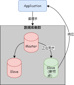 数据库增加新节点,假设 MySQL 一主两从的集群架构,集群中一个节点数据正在同步,但请求已经发到新节点上,如下图:
