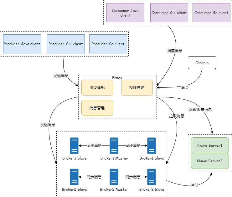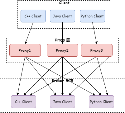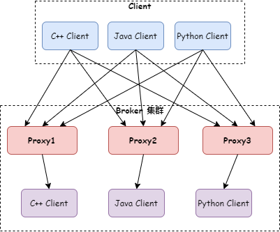 客户端所有的请求都要经过 Proxy,Proxy 将流量分发到 Broker。这样在 Proxy 可以进行流量控制和流量治理。