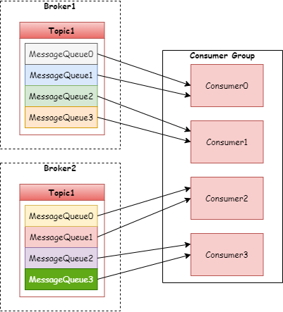 我们知道,PUSH 消费模式下,Broker 中的每个 MessageQueue 只能被同一个 Consumer Group 中的一个消费者消费,如下图:
